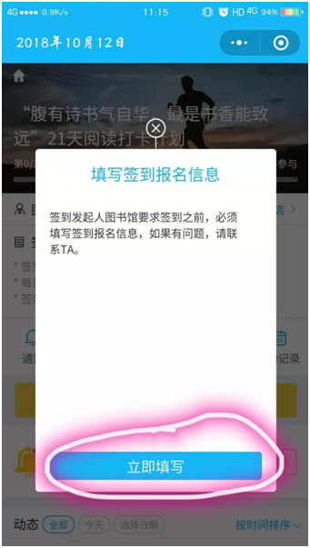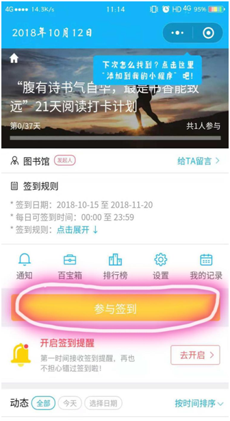 所有参加活动的师生,通过书评、读书心得、原著摘抄、有声朗读、读书瞬间等形式,以文字、图片、音频、视频作为载体,运用微信小程序“小小签到”进行打卡,完成每天的阅读任务。并将读书成果分享到自己的微信朋友圈或QQ空间,从而带动身边更多的同学走进阅读世界。