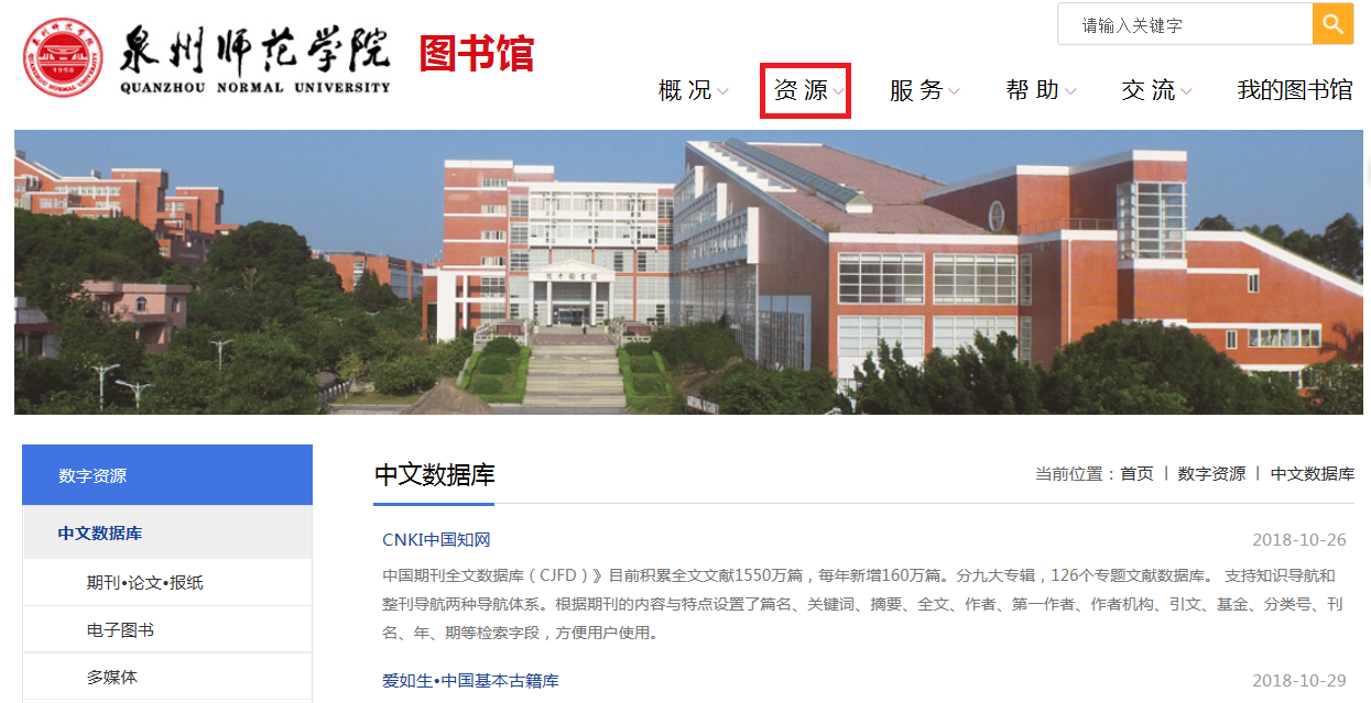 2. 通过图书馆主页中的“资源”,选择所需数据库,入库检索。