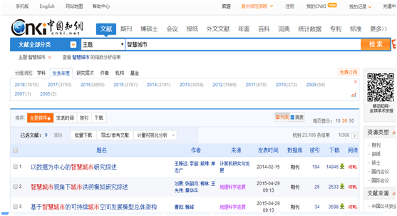 3.选择期刊类数据库(如CNKI、万方、维普)。进入数据库之后,在检索栏选择检索选项,输入检索词,点击检索。下图是CNKI的检索结果: