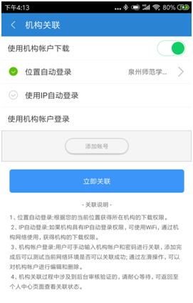 用户注册并登录首页后,点击“我的”菜单→“未关联”→开启机构账户下载按钮。