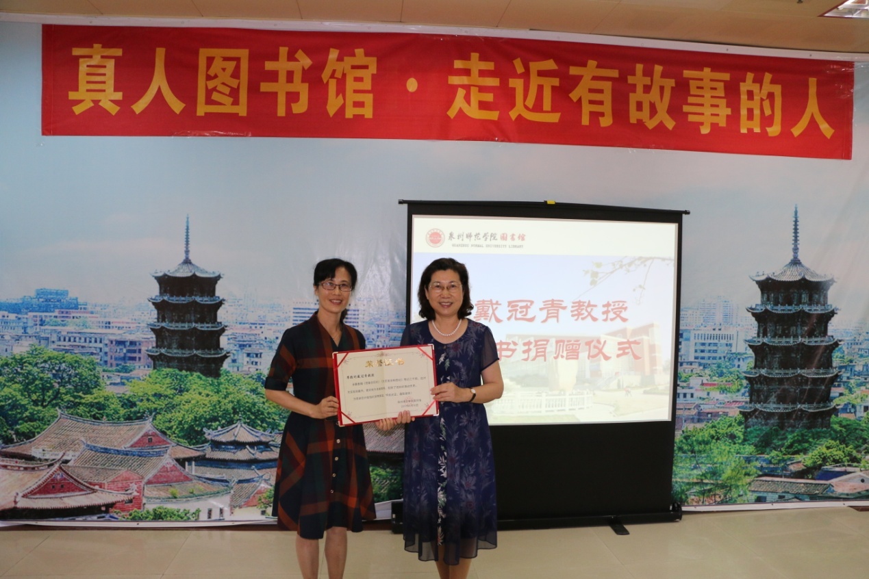 吴绮云副馆长首先代表图书馆向戴冠青教授的慷慨捐赠表示衷心感谢,并向戴教授颁发荣誉证书。