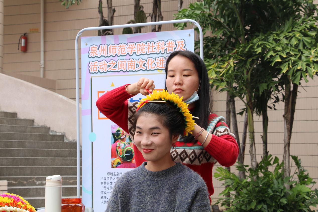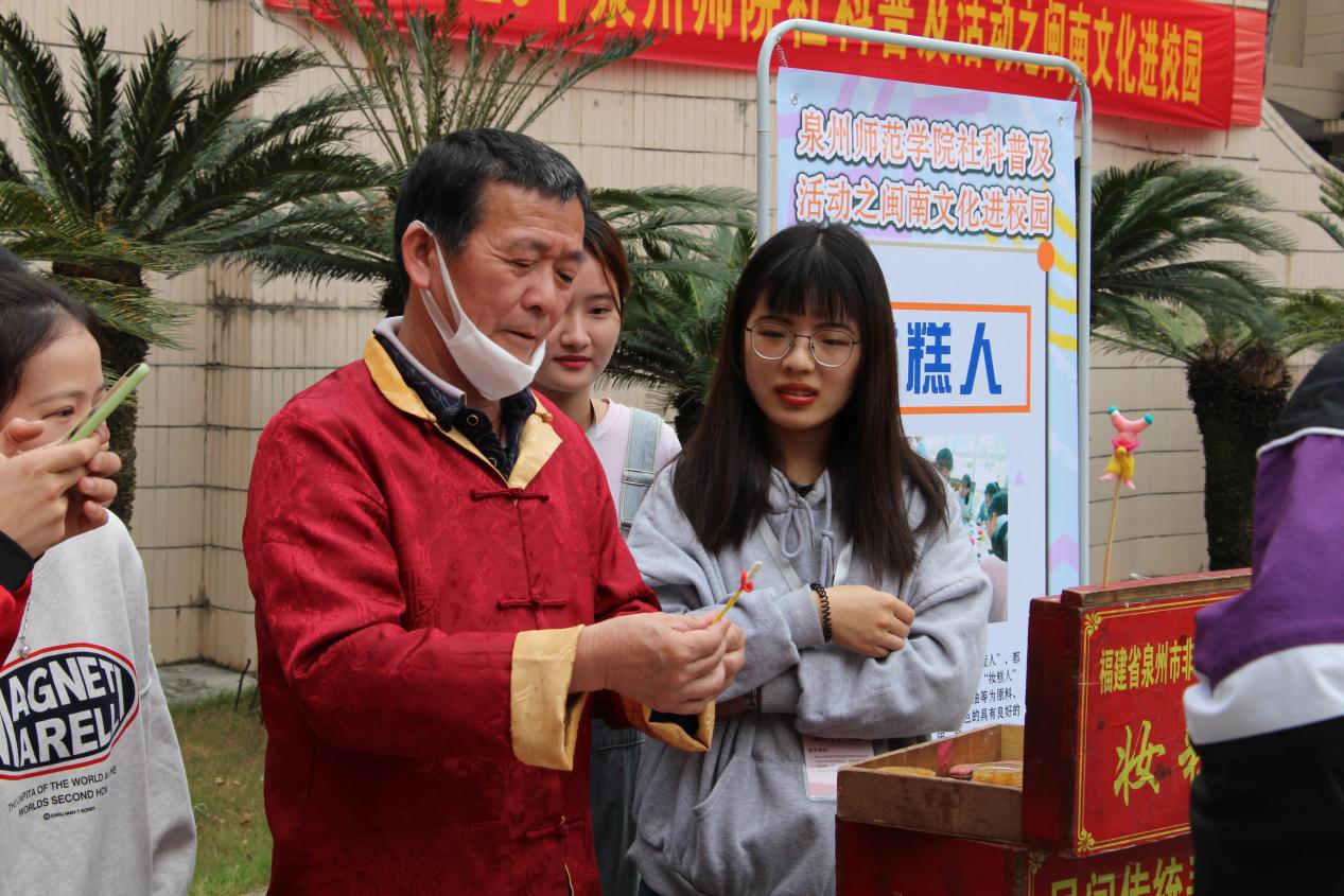 1213日下午,闽南非遗文化进校园活动在我校应用科技(航海)学院(南安校区)小广场成功举办。本次活动由校团委和校图书馆联合举办,应用科技(航海)学院(南安校区)承办,邀请妆糕人、花灯、糖画、蟳蜅女头饰梳妆、拓印等五位非遗传承人进校现场教学,吸引了一百余名师生参加体验。