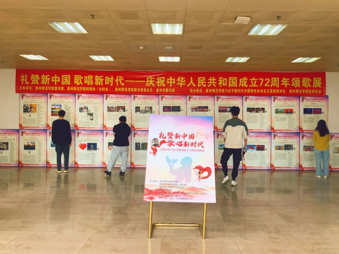 2021年11月13日-11月25日,图书馆党总支联合泉州师范学院科研处(社科处)、泉州市图书馆、泉州师范学院习近平新时代中国特色社会主义思想读书社、泉州师范学院影评协会、神州共享(北京)文化传媒有限公司共同举办“礼赞新中国 歌唱新时代——庆祝中华人民共和国成立72周年”颂歌展。
