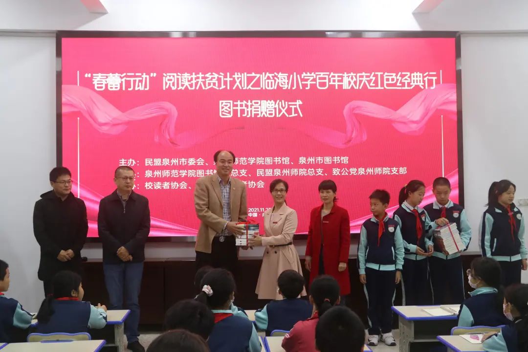 2021年11月25日上午,图书馆党总支与民盟泉州市委会、泉州市图书馆联合主办的“春蕾行动”阅读扶贫计划在临海小学启动。民盟师院总支和致公党师院支部承办、校读者协会和教科院青年志愿者协会协办。