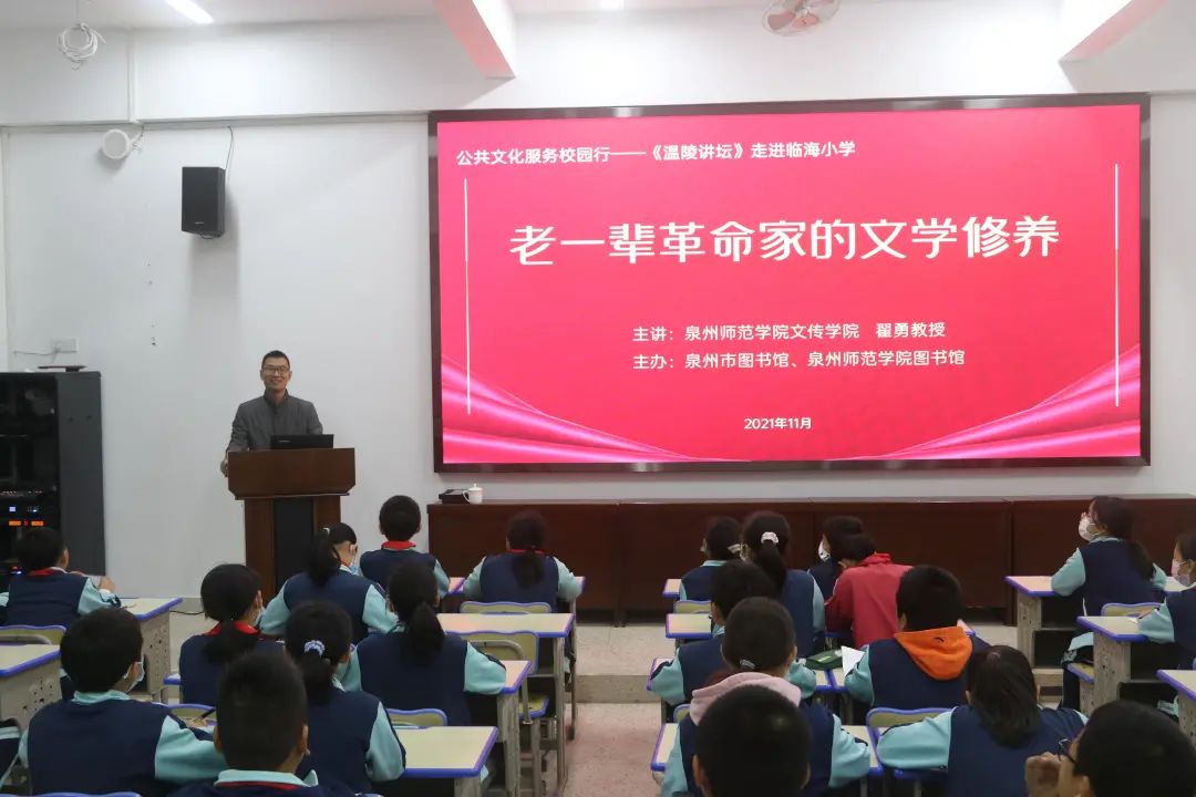 接下来,由文学与传播学院翟勇教授为小学生上了一堂题为《老一辈革命家的文学修养》的红色文化专题讲座。同时,由图书馆工作人员带领校读者协会、教科院志愿者协会的文化志愿者开展阅读辅导活动,给小学生讲海洋故事、红色故事,分享阅读中的精彩之处,交流读后感。