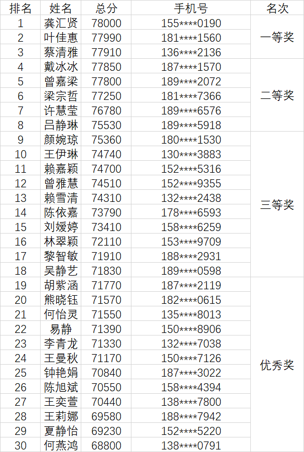 “泉州世遗文化知识”线上挑战赛活动圆满落下帷幕。此次活动共有160名同学报名参加,比赛决出一等奖3名,二等奖5名,三等奖10名,优秀奖12名。现将获奖名单公布如下: