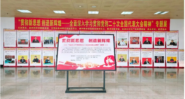 为了进一步学习贯彻中国共产党第二十次全国代表大会精神,从2023年4月14日起,图书馆党总支联合校团委、泉州市图书馆共同策划举办了“贯彻新思想 创造新辉煌——全面深入学习贯彻中国共产党第二十次全国代表大会精神”专题展。本展览计划展览至5月底,意在通过此次展览,让广大师生从习近平总书记的重要讲话中感受到前所未有的力量,并以实际行动贯彻落实习近平总书记的谆谆嘱托,为新时代迈入新征程作出更大贡献,为党和国家交上优秀的答卷。
