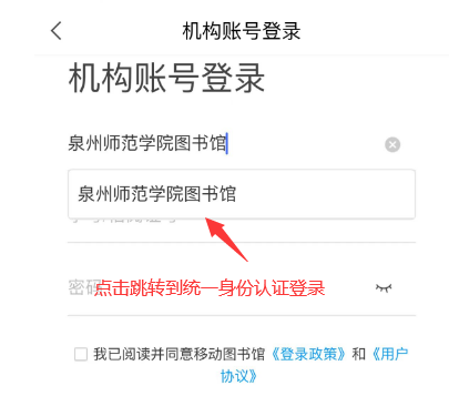 打开移动图书馆APP,在登录界面选择其他方式登录,输入单位名称:泉州师范学院图书馆,跳转到统一身份认证账户登录界面,输入统一身份认证账号密码即可登录。如下图所示。