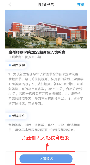 登录成功后,页面会自动跳转到图书馆页面。点击“新生入馆教育”开始闯关学习。如未跳转请点击首页切换到泉州师范学院图书馆的界面。进入新生入馆教育页面后,点击章节进行闯关学习。