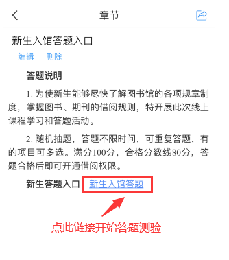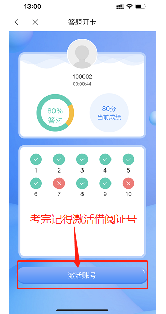 通过入馆教育学习,初步了解图书馆概况、入馆须知、馆藏资源利用等相关知识后,最后是新生入馆答题测试,检验各位读者的学习效果。测试成绩达80分以上即可激活账号,开通借阅权限。
