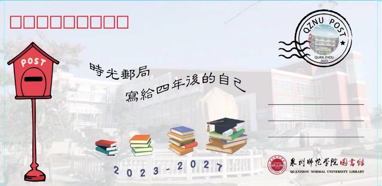 “时光邮局——写给四年后的自己”,每名新生可免费领取一份由图书馆定制的信纸和信封。数量有限,先到先得!