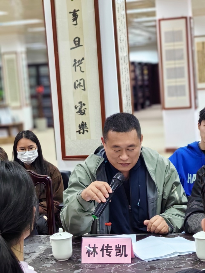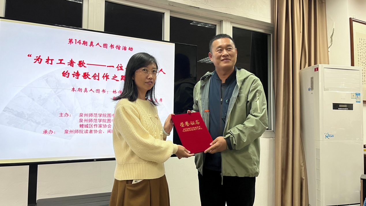 3月19日晚,以“为打工者歌——一位企业家诗人的诗歌创作之路”为主题的第十四期真人图书馆活动于图书馆五楼国家语委丝路语言文化研究中心成功举办。本期活动邀请鲤城区作家协会副主席林传凯为真人图书,鲤城区作家协会主席吴晓川和副主席陈娜娟、涂元伟、陈建强作为参与嘉宾。活动由图书馆信息咨询与开发部陈彬强老师主持,张妙霞、郑锦怀、庄云勇三位老师出席。