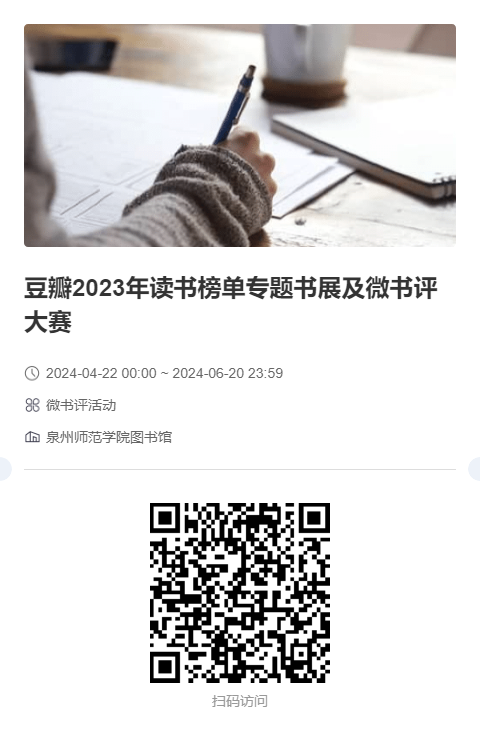 (2)活动形式: 读者从本次参展书目中自选图书,撰写微书评,并将书评内容与图书封面图片上传至活动平台进行展示与分享。 扫码进入活动页,提交微书评作品(每人限投一篇)。