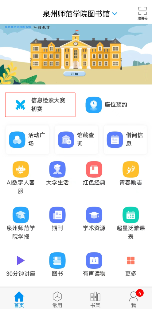 ②进入移动图书馆首页,点击“信息检索大赛初赛”参与答题