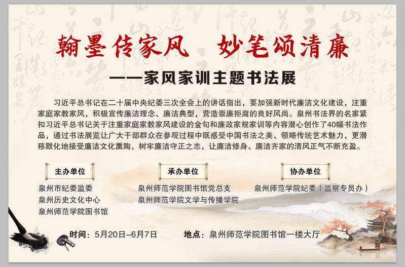 习近平总书记在二十届中央纪委三次全会上的讲话指出,要加强新时代廉洁文化建设,注重家庭家教家风,积极宣传廉洁理念、廉洁典型,营造崇廉拒腐的良好风尚。泉州书法界的名家紧扣习近平总书记关于注重家庭家教家风建设的金句和廉政家规家训等内容潜心创作了40幅书法作品,通过书法展览让广大干部群众在参观过程中既感受中国书法之美、领略传统艺术魅力,更潜移默化地接受廉洁文化熏陶,树牢廉洁守正之志,让廉洁修身、廉洁齐家的清风正气不断充盈。
