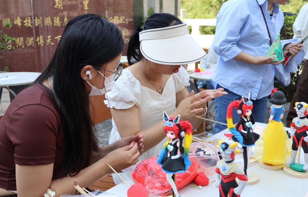 在妆糕人体验区域,一团团彩色的面团,经过黄增加老师的巧手一番揉、捏、按、搓,再用竹签、剪刀等工具将其幻化成奥特曼、白雪公主、孙悟空等形象。体验者们也一一亲手塑造色彩斑斓、形态各异的人偶,感受传统技艺的神奇与魅力。