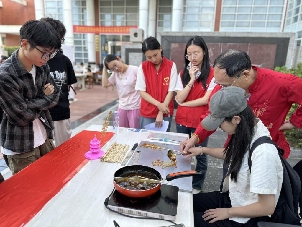在糖画体验区域,糖画非遗传承人陈学珍老师将融化的糖浆倒在铁板上,然后如同魔法师一般行云流水地勾勒出各种图案。在陈老师的指导下,体验者们勇敢尝试,制作出一个个糖画,幸福感从指尖传递到心底。