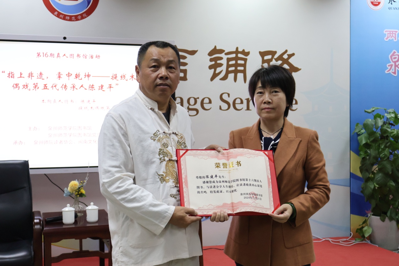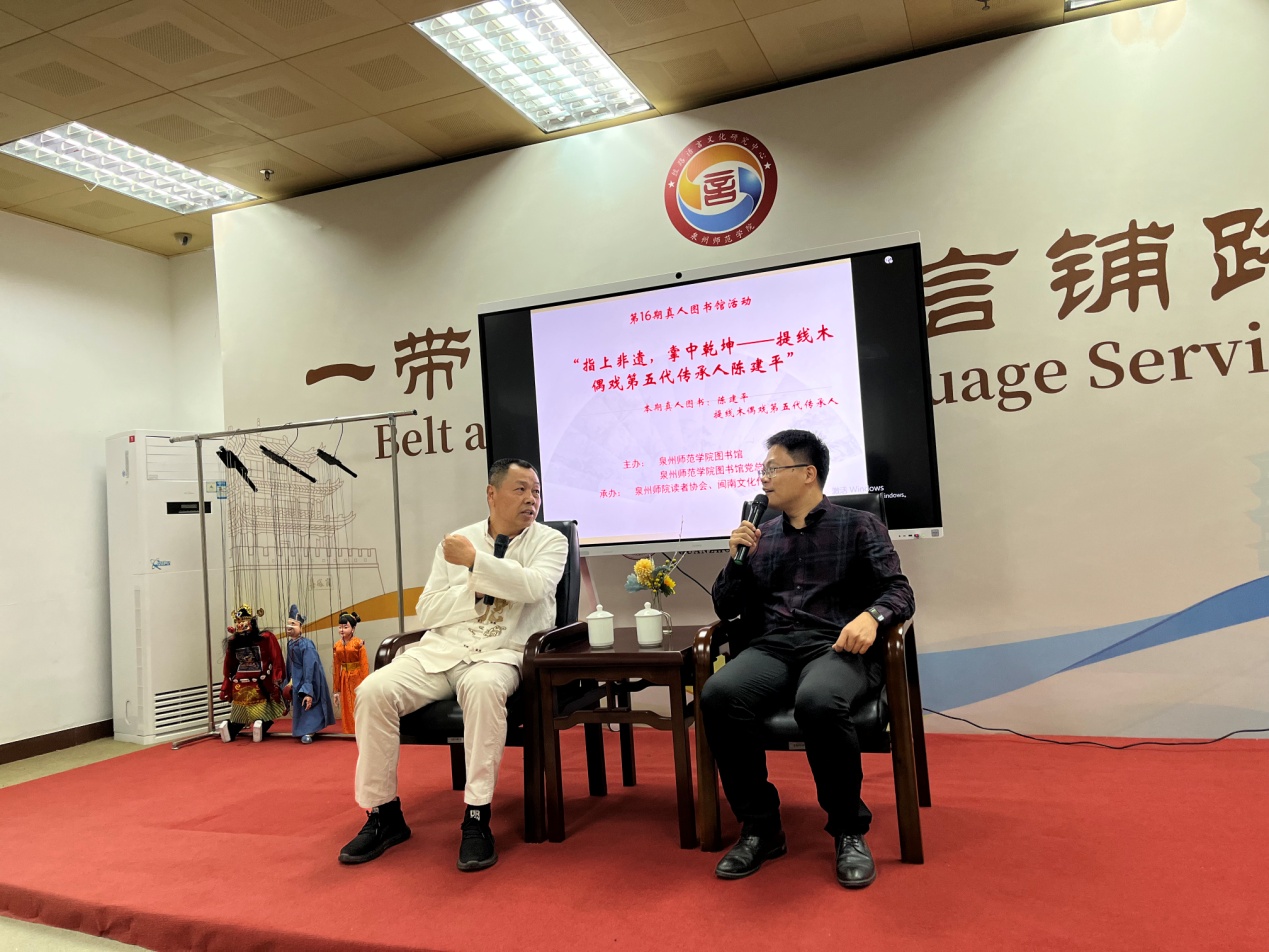 11月21日晚,以“指上非遗,掌中乾坤”为主题的第十六期真人图书馆活动于俊秀图书馆五楼成功举办。泉州市非物质文化遗产项目提线木偶戏第五代传承人、南安官桥提线木偶剧团团长陈建平受邀担任本期真人图书,我校图书馆副馆长(主持工作)胡俊梅博士、信息咨询与开发部张妙霞老师、张惠萍老师及技术部康汉彬老师参加。本期活动由图书馆信息咨询与开发部陈彬强老师主持。