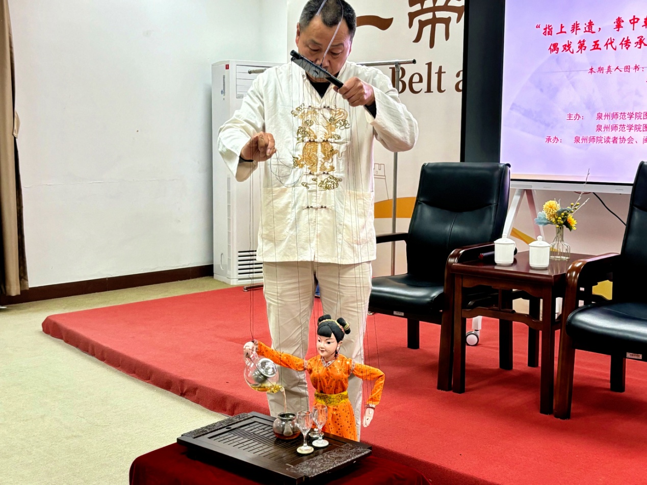 活动中,陈建平现场表演了提线木偶戏代表作《沙弥下山》,现场掌声雷动;随后又表演了钟馗拔剑、插剑、跨步等,活灵活现;更为精彩的是木偶小旦工夫茶表演环节,泡茶、倒茶、举杯等一连串动作,引得台下同学们连连叫好。