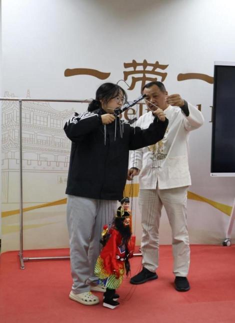 在体验环节,三名体验者在陈建平的悉心指导下,手指灵动地操纵着丝线,通过“挑”“勾”“甩”等动作来表现木偶的抬手、抬腿、走路等形态,令台下的师生羡慕不已。