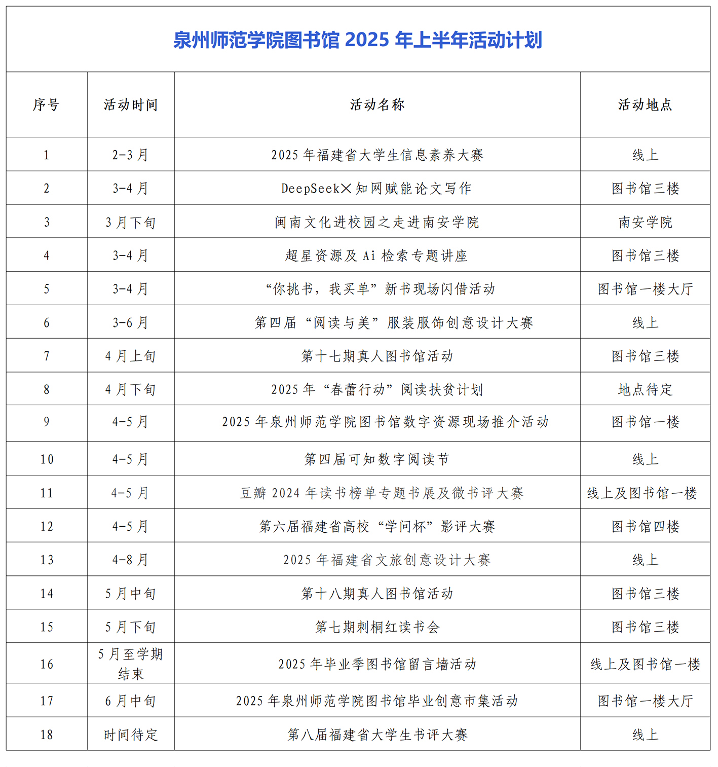 泉州师范学院图书馆2025年上半年活动计划