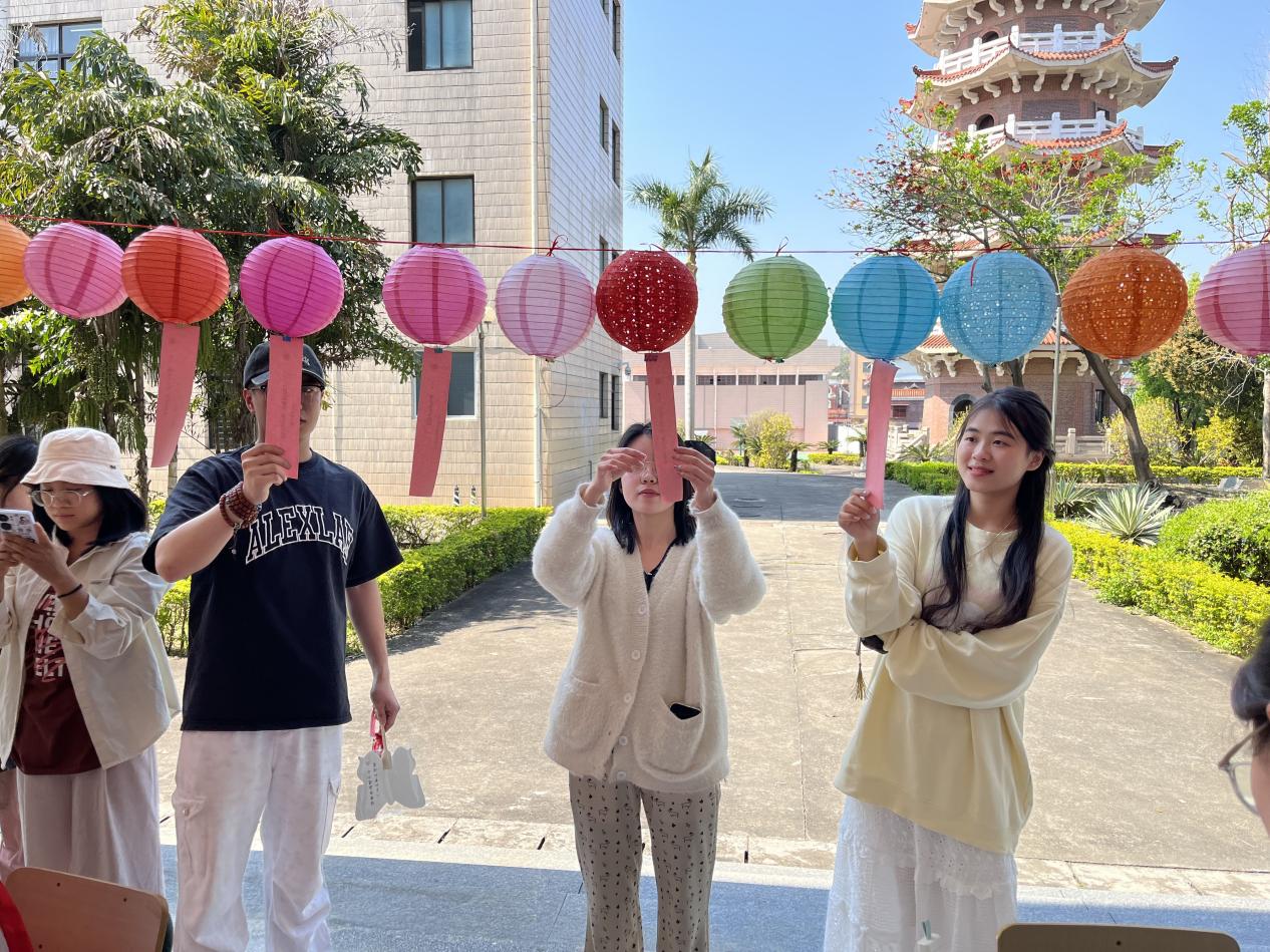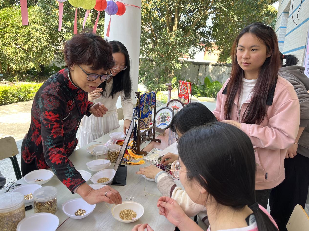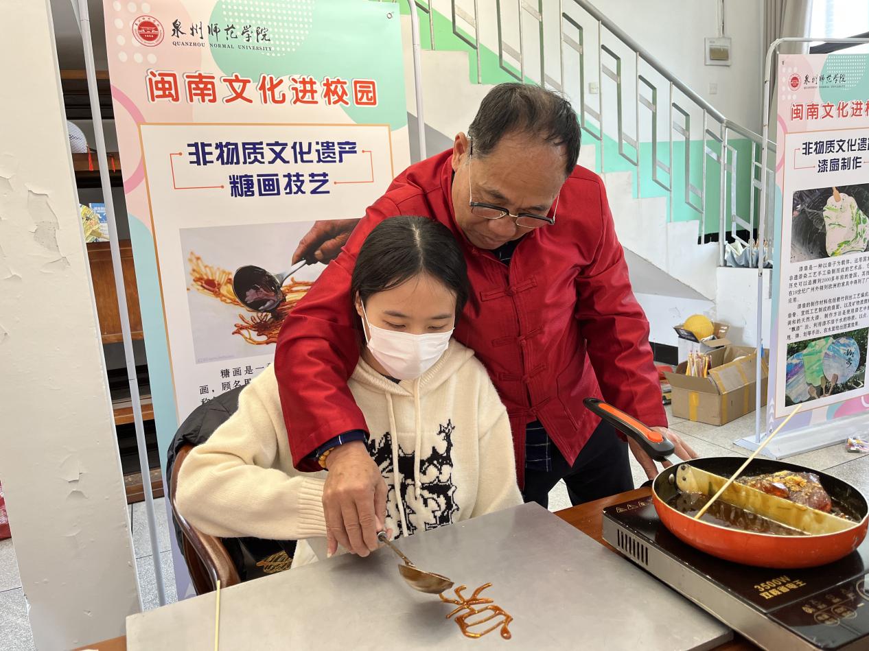 活动现场气氛热烈,非遗技艺的魅力令人目不暇接。妆糕人传承人张明铁老师以巧手捏制出栩栩如生的彩色人偶,引得师生连连赞叹;糖画传承人陈学珍老师以糖浆为墨,在案板上勾勒出花鸟鱼虫等灵动图案,甜香四溢;漆扇传承人刘璟耀老师以水为媒,通过波纹将漆料晕染出独特纹理,再转印至扇面,形成一件件绚丽的艺术品;珠绣传承人陈克忍老师以针线串起五彩珠片,在布面上绣出闽南传统纹样,精致华美;永春纸织画传承人张巧云老师以细密的经纬编织宣纸,创作出立体生动的山水画卷;安溪竹藤编传承人陈红萍老师则现场展示竹藤编织技艺,将柔韧的竹条与藤蔓巧妙结合,制成提篮、杯垫等兼具实用与美感的作品。现场师生在各位传承人的指导下,沉浸式体验了闽南传统技艺的独特魅力。闽南文化猜灯谜专区更是人气高涨,师生们驻足竞猜,在趣味互动中深入感受闽南语言与习俗的独特韵味。