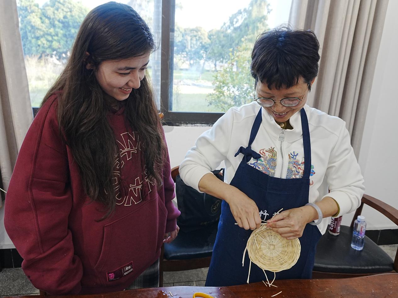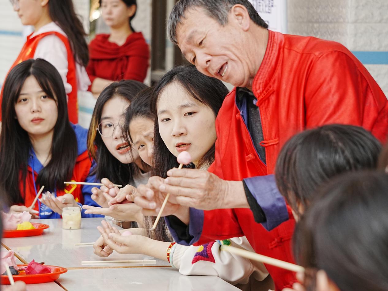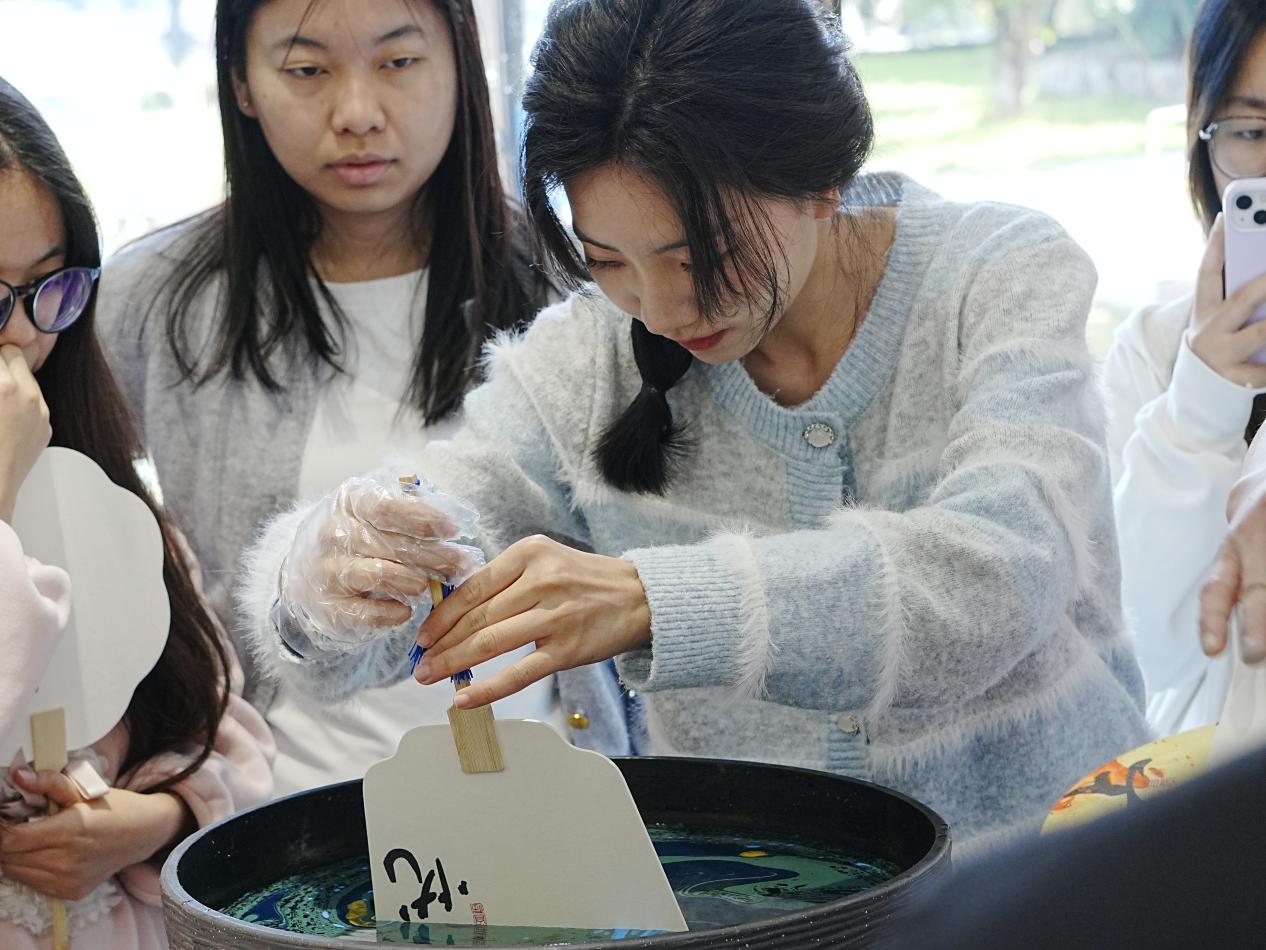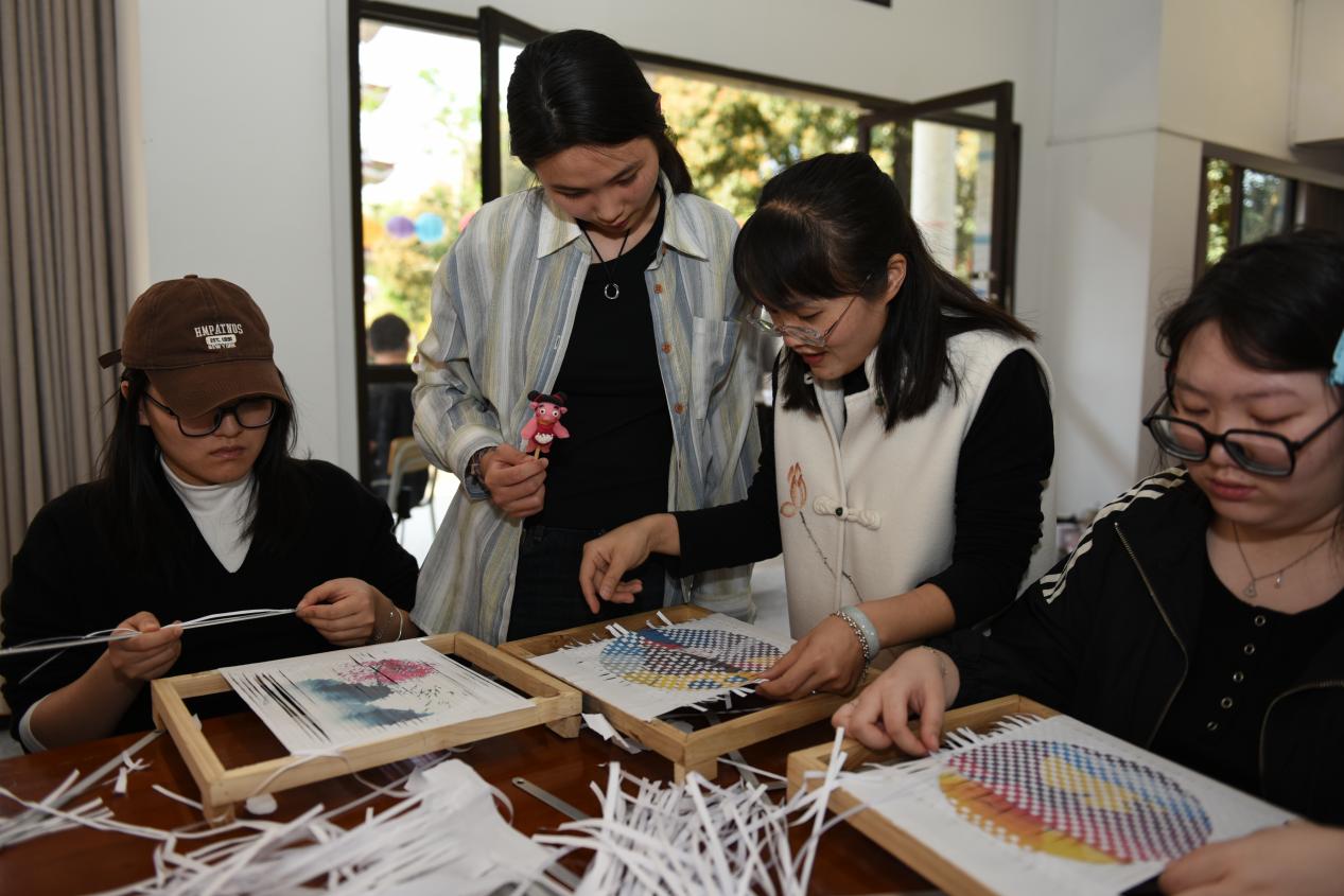 活动现场气氛热烈,非遗技艺的魅力令人目不暇接。妆糕人传承人张明铁老师以巧手捏制出栩栩如生的彩色人偶,引得师生连连赞叹;糖画传承人陈学珍老师以糖浆为墨,在案板上勾勒出花鸟鱼虫等灵动图案,甜香四溢;漆扇传承人刘璟耀老师以水为媒,通过波纹将漆料晕染出独特纹理,再转印至扇面,形成一件件绚丽的艺术品;珠绣传承人陈克忍老师以针线串起五彩珠片,在布面上绣出闽南传统纹样,精致华美;永春纸织画传承人张巧云老师以细密的经纬编织宣纸,创作出立体生动的山水画卷;安溪竹藤编传承人陈红萍老师则现场展示竹藤编织技艺,将柔韧的竹条与藤蔓巧妙结合,制成提篮、杯垫等兼具实用与美感的作品。现场师生在各位传承人的指导下,沉浸式体验了闽南传统技艺的独特魅力。闽南文化猜灯谜专区更是人气高涨,师生们驻足竞猜,在趣味互动中深入感受闽南语言与习俗的独特韵味。