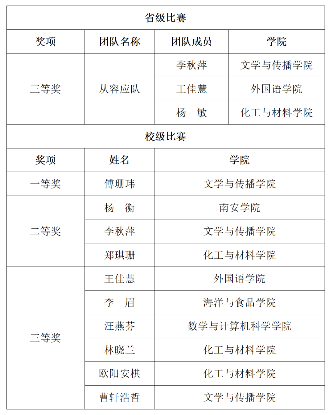 此外,根据校级选拔赛竞赛规则,按答题成绩高低进行排名,评出一等奖1名,二等奖3名,三等奖6名。省赛和校赛获奖名单如下: