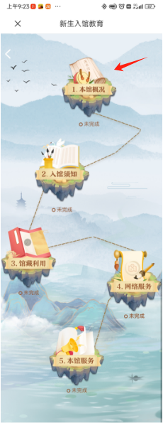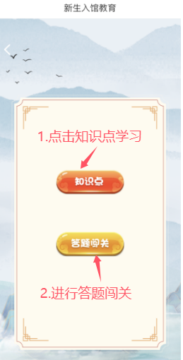进入“新生入馆教育”页面,内有五关。每关均先点击“知识点”进行学习,然后再进行“答题闯关”。