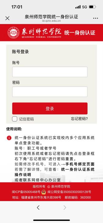 微信公众号:关注泉州师范学院图书馆微信公众号,点击左下角“微服务大厅”,点击“入馆教育”,跳转到统一身份认证账户登录界面,输入统一身份认证账号和密码即可登录。