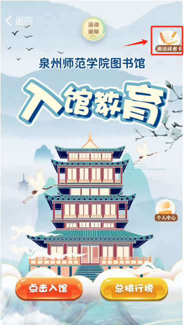 登录成功后,将自动跳转到泉州师范学院图书馆的界面。点击“新生入馆教育”,即可开始学习及闯关。如未自动跳转,请点击首页,然后自行切换到泉州师范学院图书馆的界面。