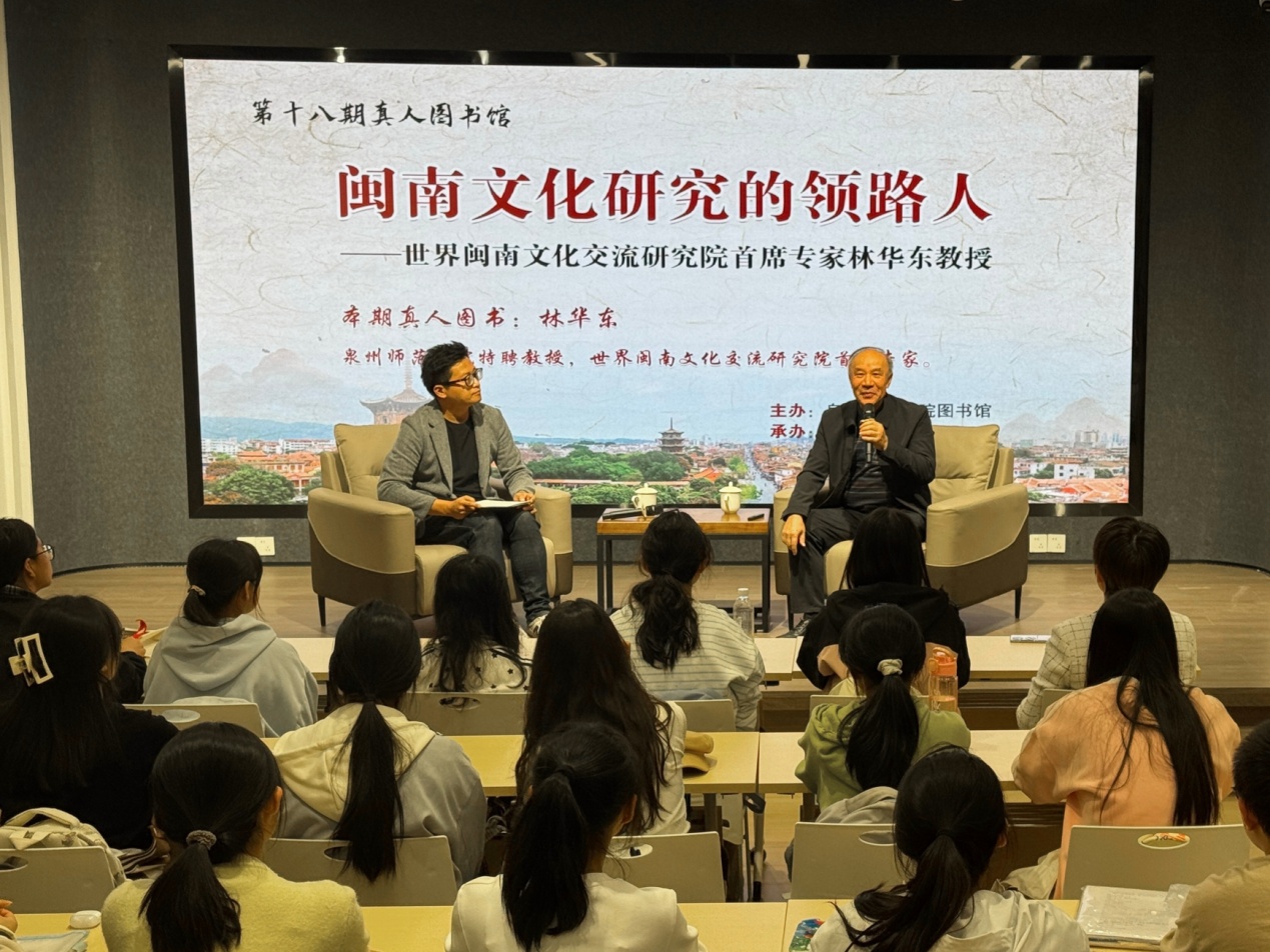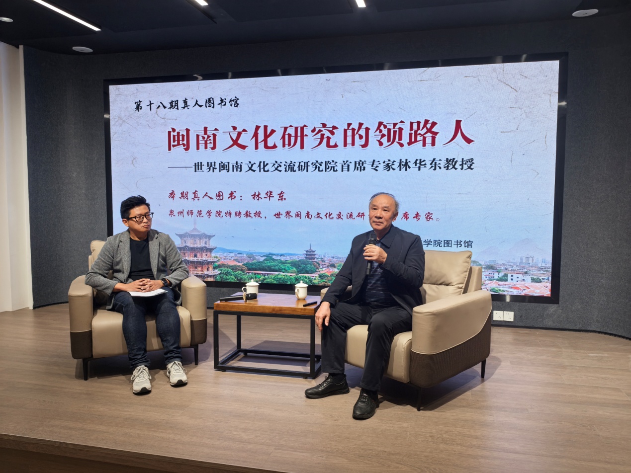 2025年11月18日晚,第十八期“真人图书馆”活动在图书馆三楼红色悦读空间举行。本次活动以“闽南文化研究的领路人”为主题,特邀世界闽南文化交流研究院首席专家、我校特聘教授林华东作为“真人图书”,历史系主任刘智豪教授担任嘉宾主持,与在场师生共话闽南文化的传承与发展。