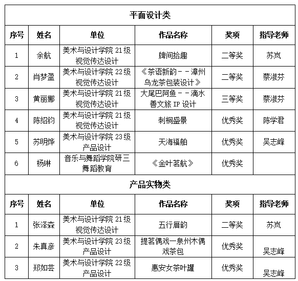 近日,“清新福建·品绘八闽——2025年福建省高校大学生文创设计大赛”圆满结束。我校共有21个作品参赛,获平面设计类二等奖2名、三等奖1名、优秀奖3名;产品实物类二等奖1名、优秀奖2名。美术与设计学院苏岚、蔡淑芬老师荣获“优秀指导教师”,校图书馆荣获“优秀组织奖”。