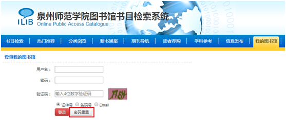 答:读者如已注册邮箱并验证成功,忘记密码时请点击“密码重置”,进入密码重置页面后,根据页面右方的提示操作。读者如未注册邮箱,忘记密码时,请携带有效证件(工作证、学生证或身份证)到图书馆一楼服务台重置密码。
